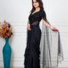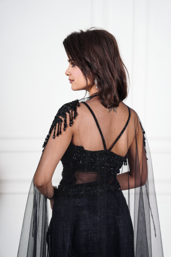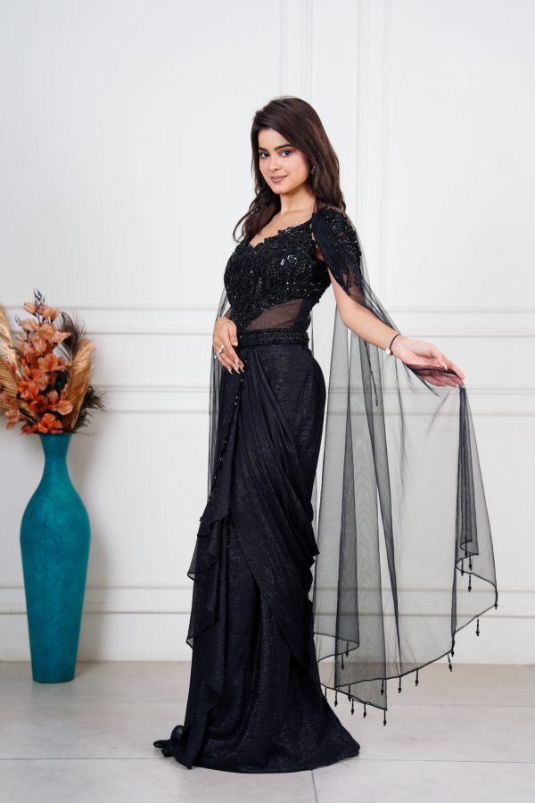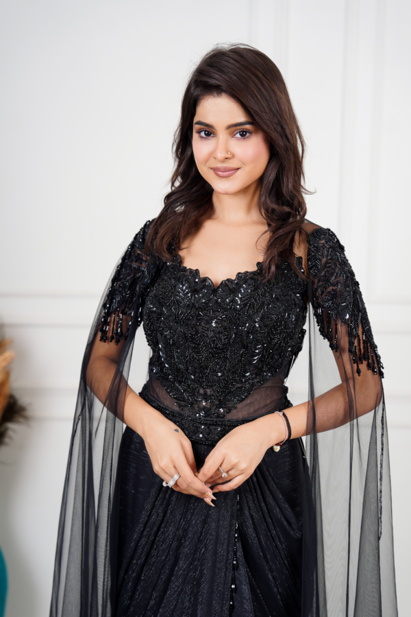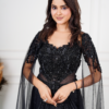 | Description | Make a striking statement in this black drape dress, crafted for refined evening elegance. The embellished bodice features intricate sequins and zarkan work a flattering sweetheart neckline, paired with sheer cape sleeves that add drama and grace. A softly shimmering draped skirt enhances the silhouette with fluid movement. Perfect for cocktail parties, receptions, and formal nights, this dress blends modern sophistication with timeless allure, offering comfort, confidence, and standout style for every special occasion. Designed to leave a lasting impression wherever worn. |