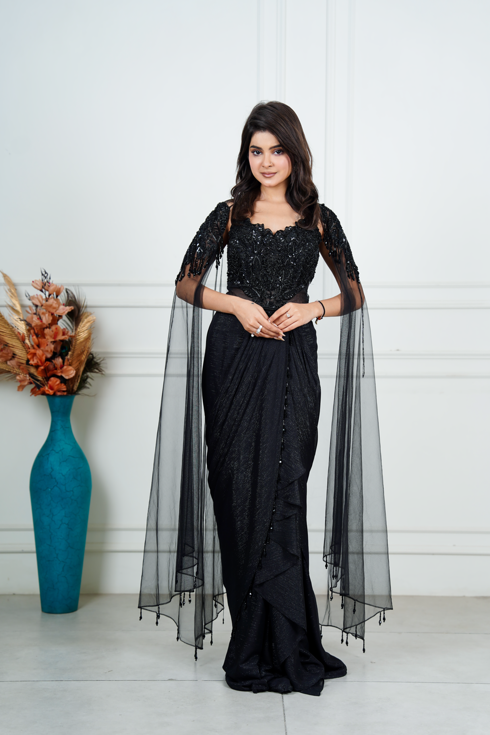 | Description | Make a striking statement in this black drape dress, crafted for refined evening elegance. The embellished bodice features intricate sequins and zarkan work a flattering sweetheart neckline, paired with sheer cape sleeves that add drama and grace. A softly shimmering draped skirt enhances the silhouette with fluid movement. Perfect for cocktail parties, receptions, and formal nights, this dress blends modern sophistication with timeless allure, offering comfort, confidence, and standout style for every special occasion. Designed to leave a lasting impression wherever worn. |