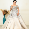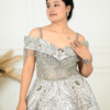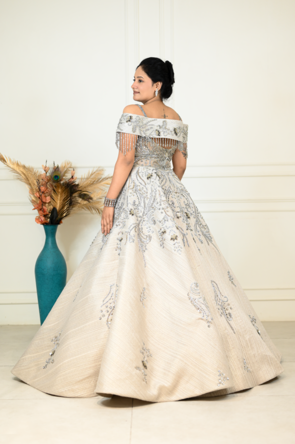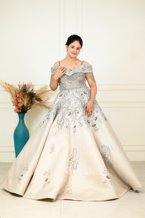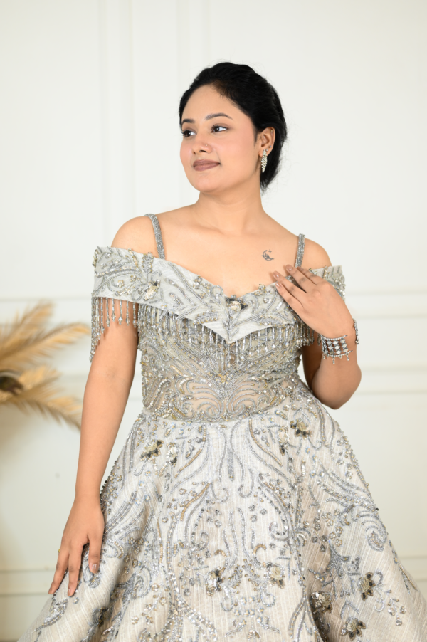 | Description | Make a graceful statement with this exquisite sage green gown, designed for elegant celebrations. The off-shoulder neckline features delicate beaded fringe detailing, adding a touch of glamour. Intricate silver and crystal embroidery adorns the fitted bodice, flowing beautifully into a voluminous flared skirt with ornate motis. Crafted from luxurious fabric, this gown offers a regal silhouette and refined sparkle. Perfect for weddings, receptions, and evening soirées, it blends classic sophistication with modern charm effortlessly. |