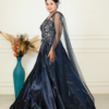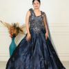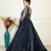 | Description | Step into refined glamour with this captivating navy blue gown, designed for statement occasions. The intricately embellished bodice features ornate moti and sequins work, complemented by a unique ruffled strap and sheer falling sleeve for a contemporary touch. Flowing into a voluminous Roman organza skirt with subtle scattered embroidery, the gown exudes elegance and movement. Perfect for weddings, receptions, and evening events, this luxurious piece blends classic craftsmanship with modern sophistication effortlessly. |
