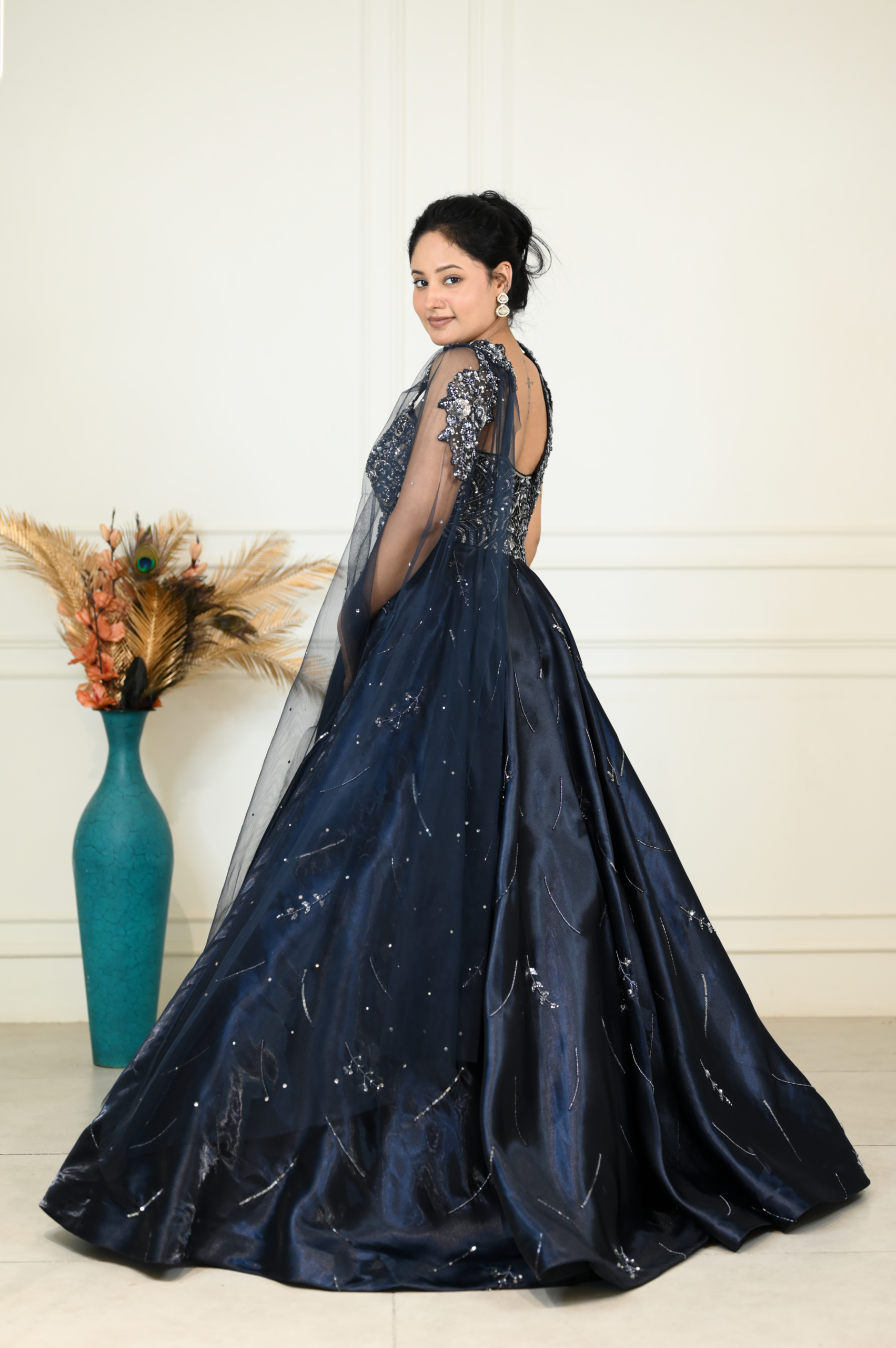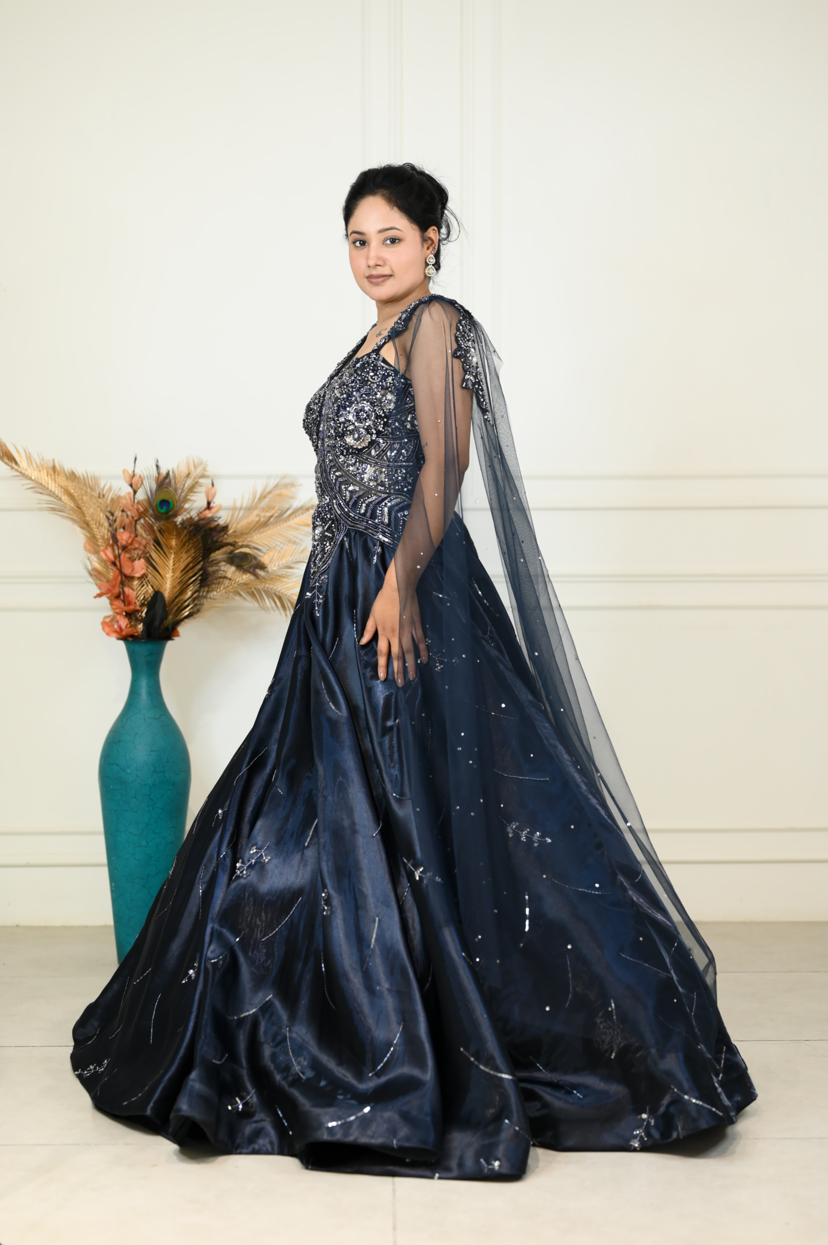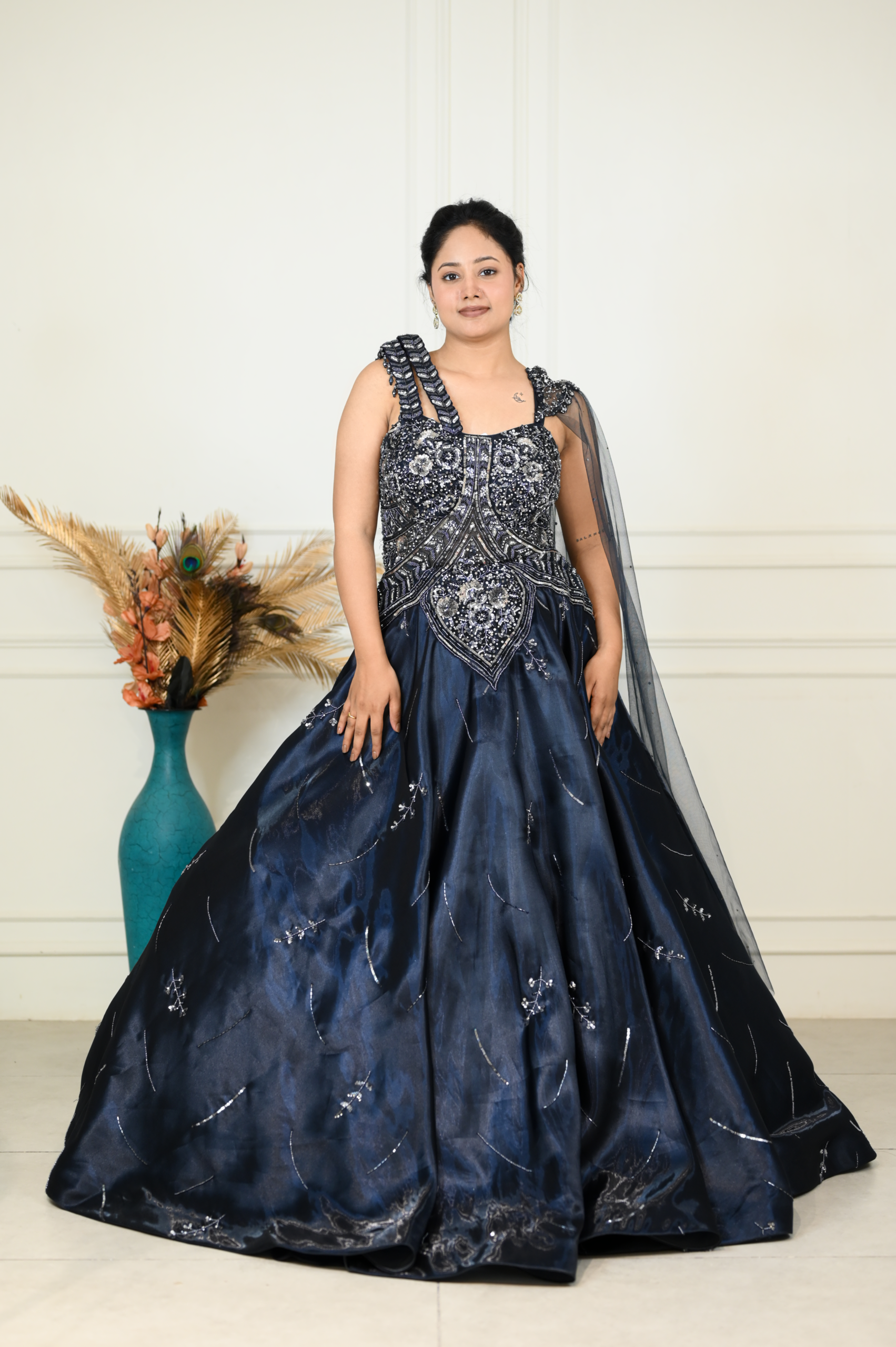 | Description | Step into refined glamour with this captivating navy blue gown, designed for statement occasions. The intricately embellished bodice features ornate moti and sequins work, complemented by a unique ruffled strap and sheer falling sleeve for a contemporary touch. Flowing into a voluminous Roman organza skirt with subtle scattered embroidery, the gown exudes elegance and movement. Perfect for weddings, receptions, and evening events, this luxurious piece blends classic craftsmanship with modern sophistication effortlessly. |