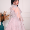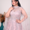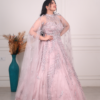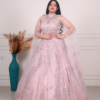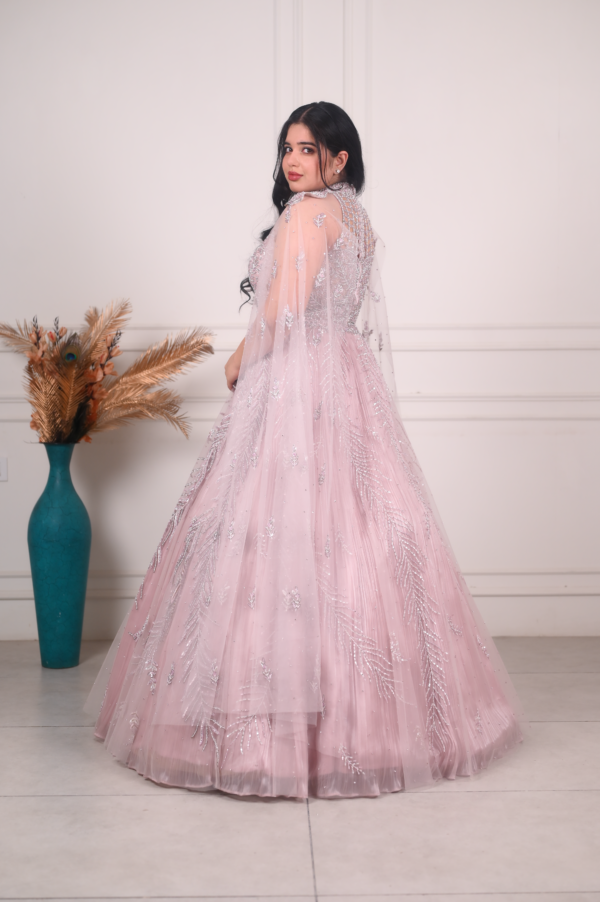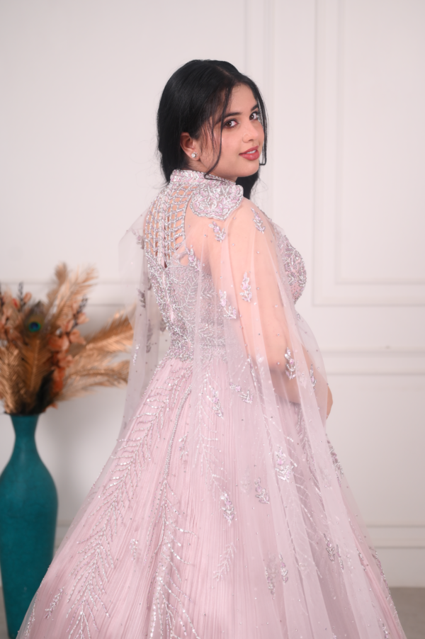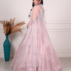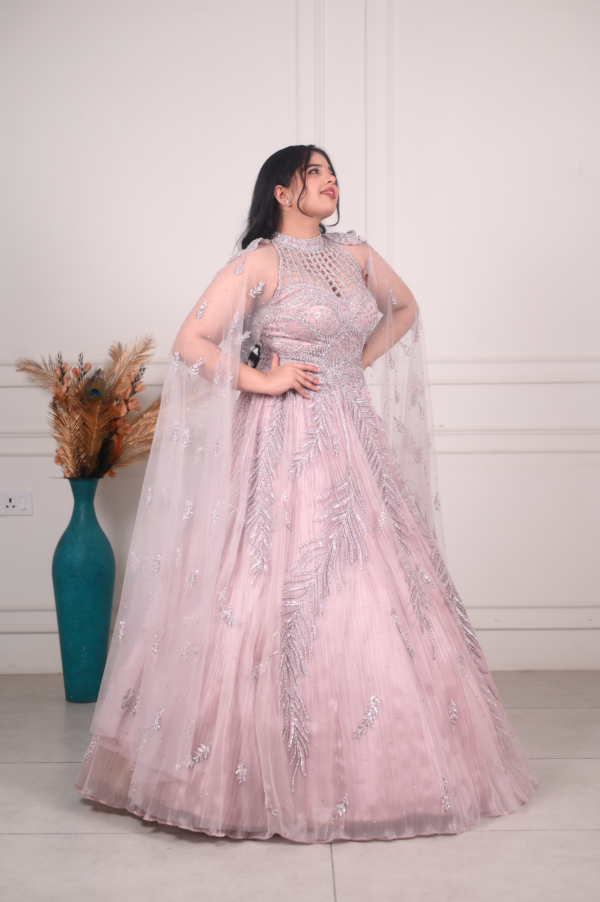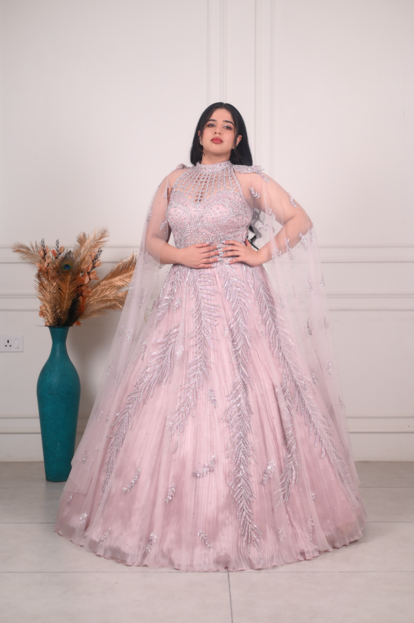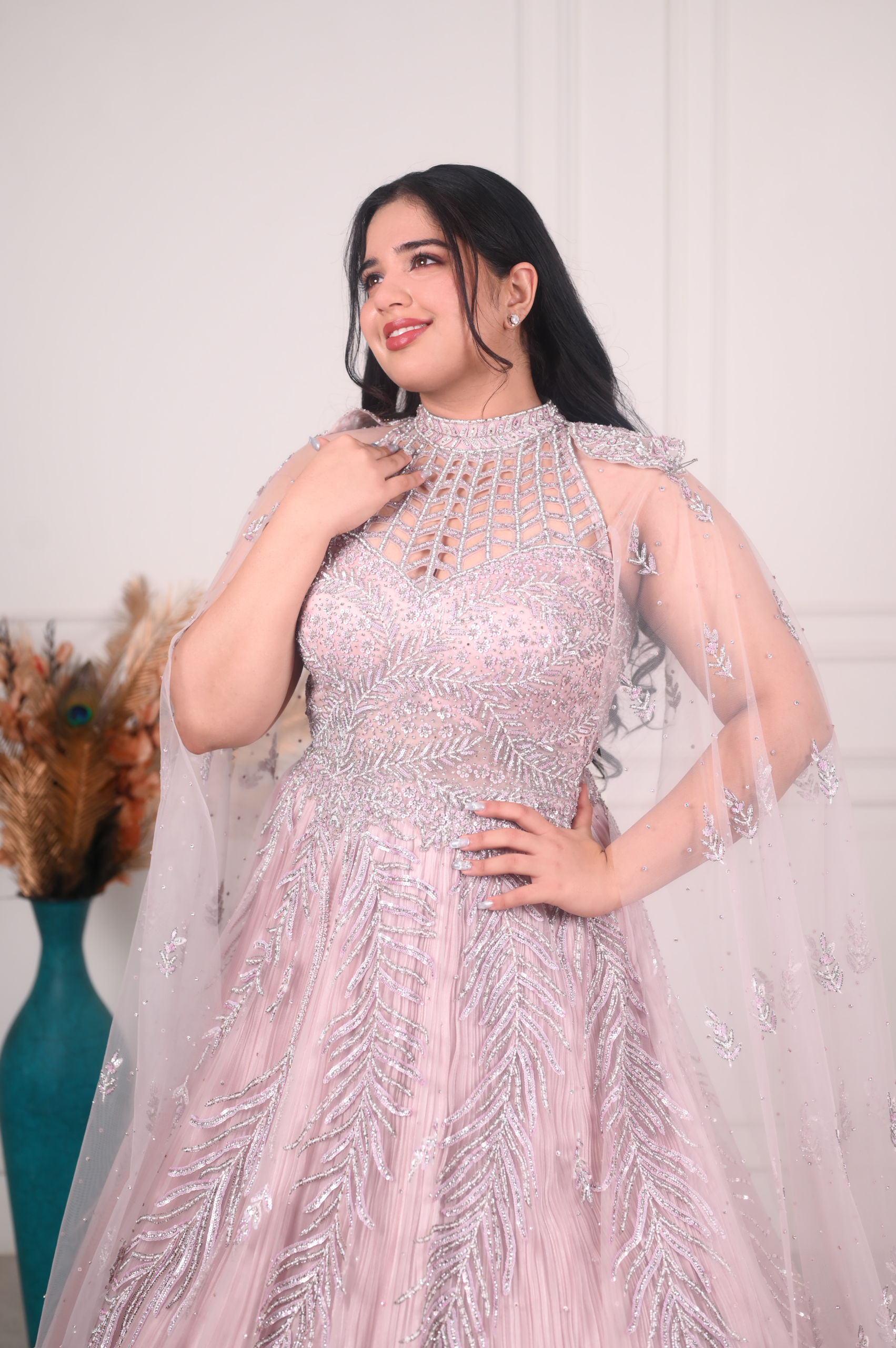 | Description | Embrace soft elegance with this romantic blush pink gown, designed to captivate with delicate detailing. The halter neckline and fitted bodice are adorned with intricate zarkan embroidery, creating a graceful, elongated silhouette. Flowing into a pleated skirt with leaf-inspired embellishments, the gown is complemented by a sheer embellished cape that adds ethereal movement. Crafted from fine net and crushed chiffon, this gown is perfect for weddings, receptions, and evening celebrations, blending modern sophistication with timeless charm. |