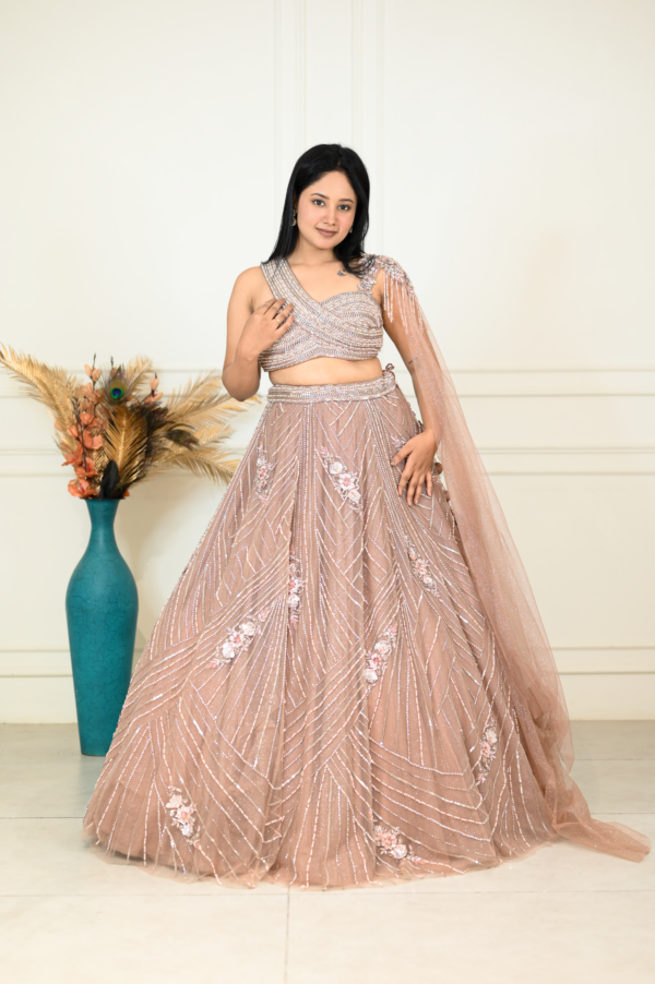 Description This exquisite rust lehenga set radiates soft elegance and contemporary charm. Crafted on a sheer net base, the lehenga features intricate linear sequin and white pearl embroidery accented with delicate floral motifs for a refined shimmer. The sleeveless blouse is richly embellished with layered beadwork, while the matching dupatta drapes gracefully with subtle sparkle. Ideal for weddings, cocktail nights, and festive occasions, this rust lehenga blends romantic tones, detailed craftsmanship, and effortless sophistication for a standout celebration look.