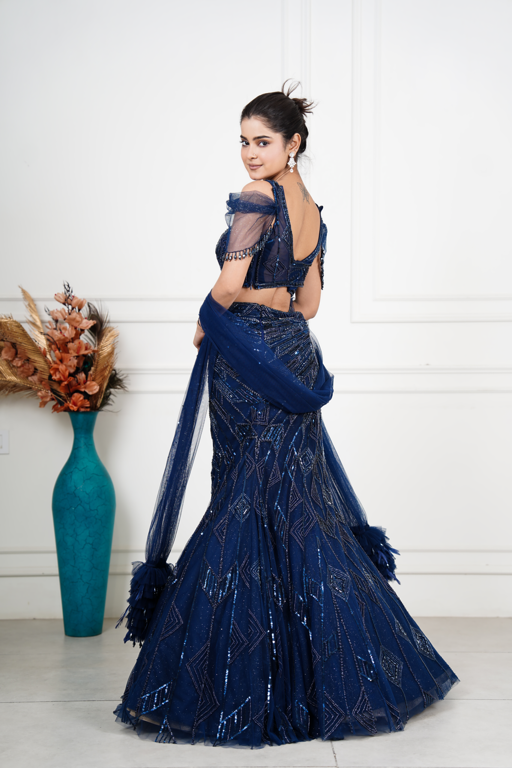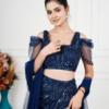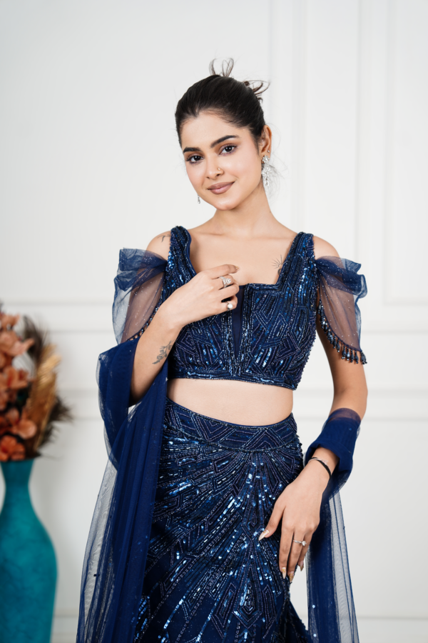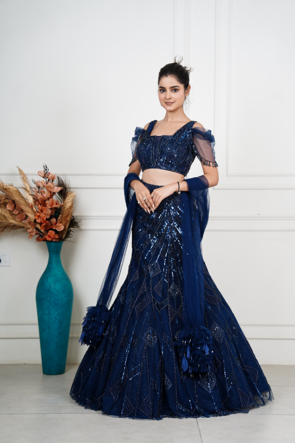 | Description | This elegant navy blue lehenga set embodies refined glamour and modern grace. The embellished blouse features intricate geometric sequin embroidery with delicate sheer sleeves, adding a contemporary edge. Paired with a beautifully flared skirt adorned with shimmering patterns, the ensemble creates effortless movement and depth. Finished with a soft net dupatta accented by statement tassels, this lehenga is perfect for evening weddings, receptions, and festive occasions, offering a sophisticated blend of craftsmanship, luxury, and timeless style. |
