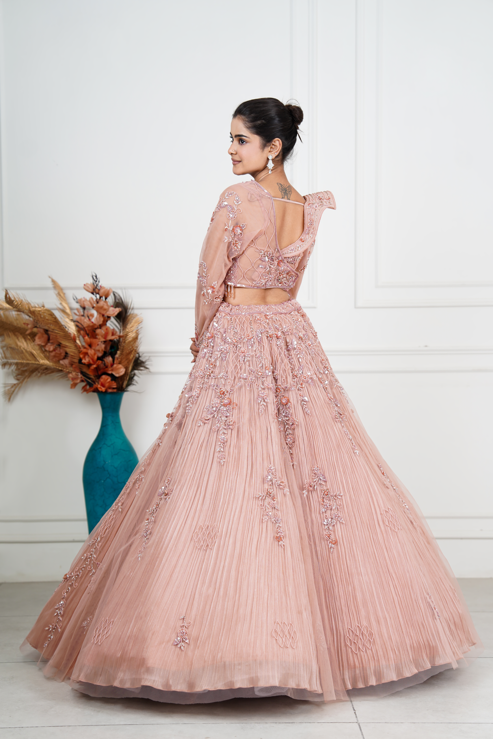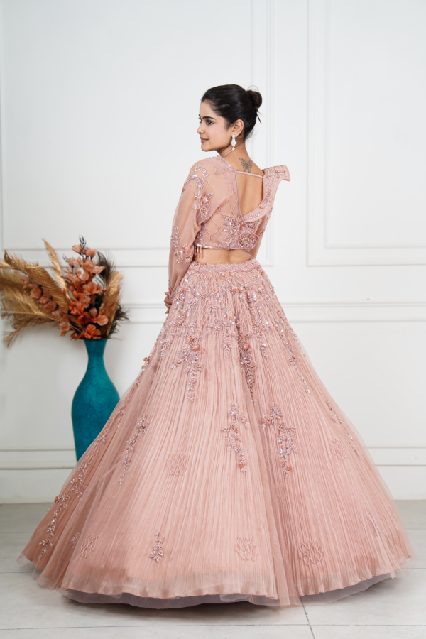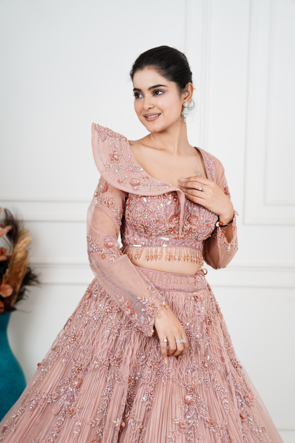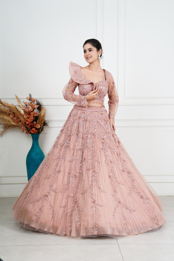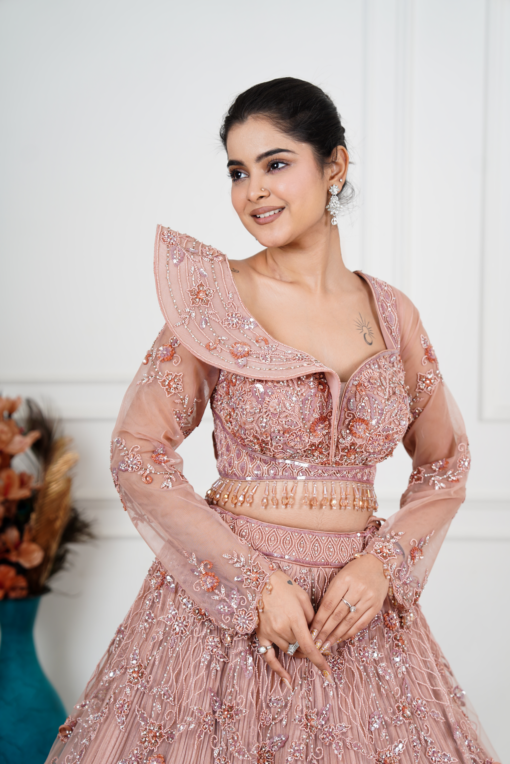 | Description | This graceful rust lehenga set captures romantic elegance with a contemporary silhouette. Crafted on a soft net base, the lehenga is adorned with intricate floral embroidery and delicate sequin detailing that adds a subtle shimmer. The statement blouse features a sculpted neckline, sheer full sleeves, and exquisite embellishments for a refined look. Paired with a beautifully flared skirt that flows effortlessly, this ensemble is perfect for weddings, receptions, and festive celebrations, offering timeless charm and luxurious craftsmanship. |