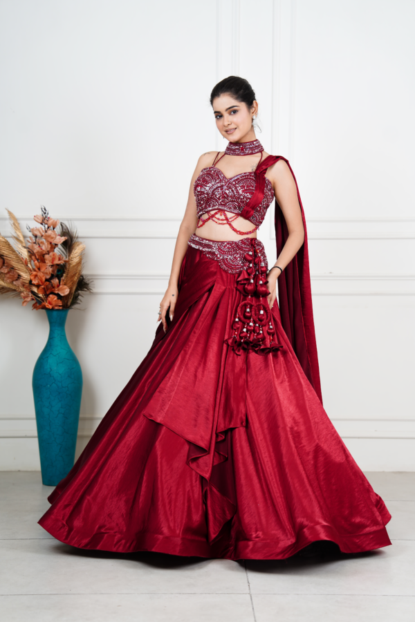 | Description | This stunning red lehenga set exudes bold elegance and festive glamour. The intricately embellished blouse features rich sequin and crystal 3D work with a stylish choker neckline and delicate waist detailing for a statement look. Paired with a lustrous, layered skirt that flows beautifully, the ensemble offers dramatic movement and sophistication. Finished with tassel accents and a matching dupatta, this lehenga is perfect for weddings, receptions, and celebratory occasions, embodying timeless tradition with a modern, couture-inspired appeal. |