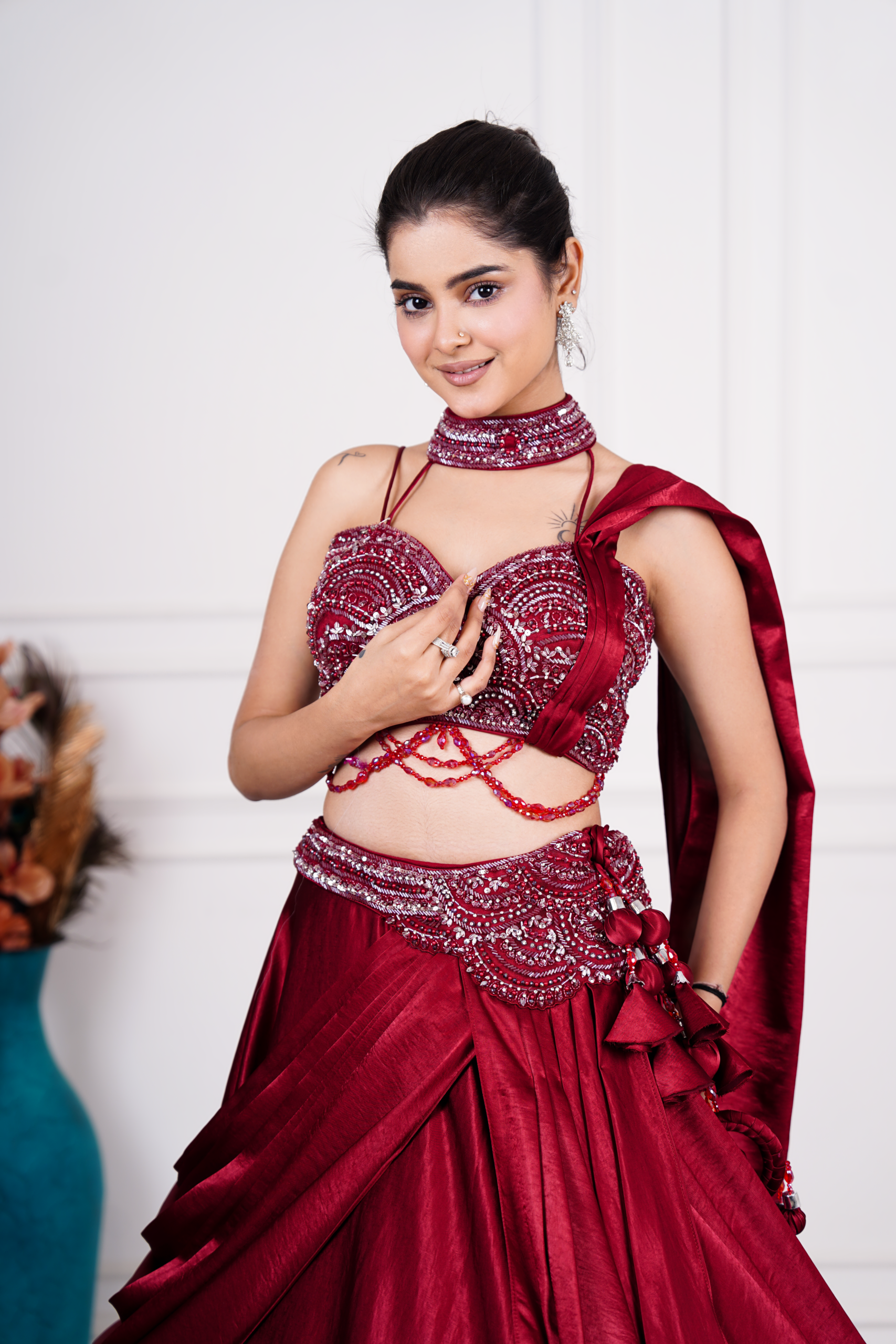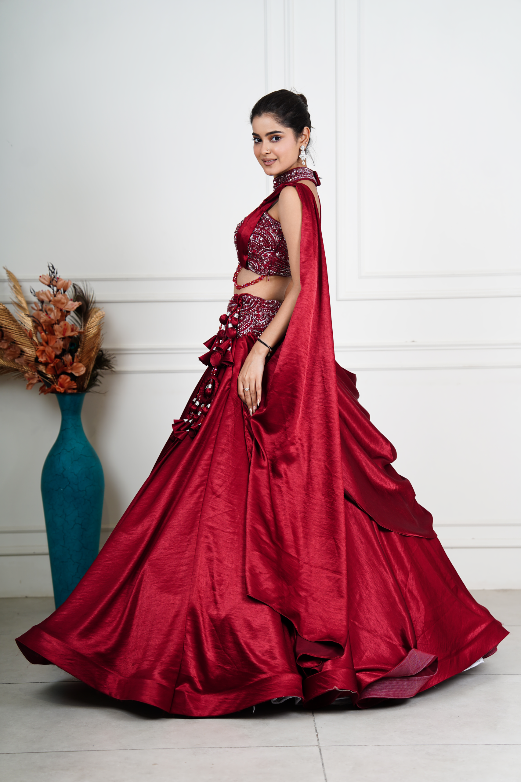| Description | This stunning red lehenga set exudes bold elegance and festive glamour. The intricately embellished blouse features rich sequin and crystal 3D work with a stylish choker neckline and delicate waist detailing for a statement look. Paired with a lustrous, layered skirt that flows beautifully, the ensemble offers dramatic movement and sophistication. Finished with tassel accents and a matching dupatta, this lehenga is perfect for weddings, receptions, and celebratory occasions, embodying timeless tradition with a modern, couture-inspired appeal. |