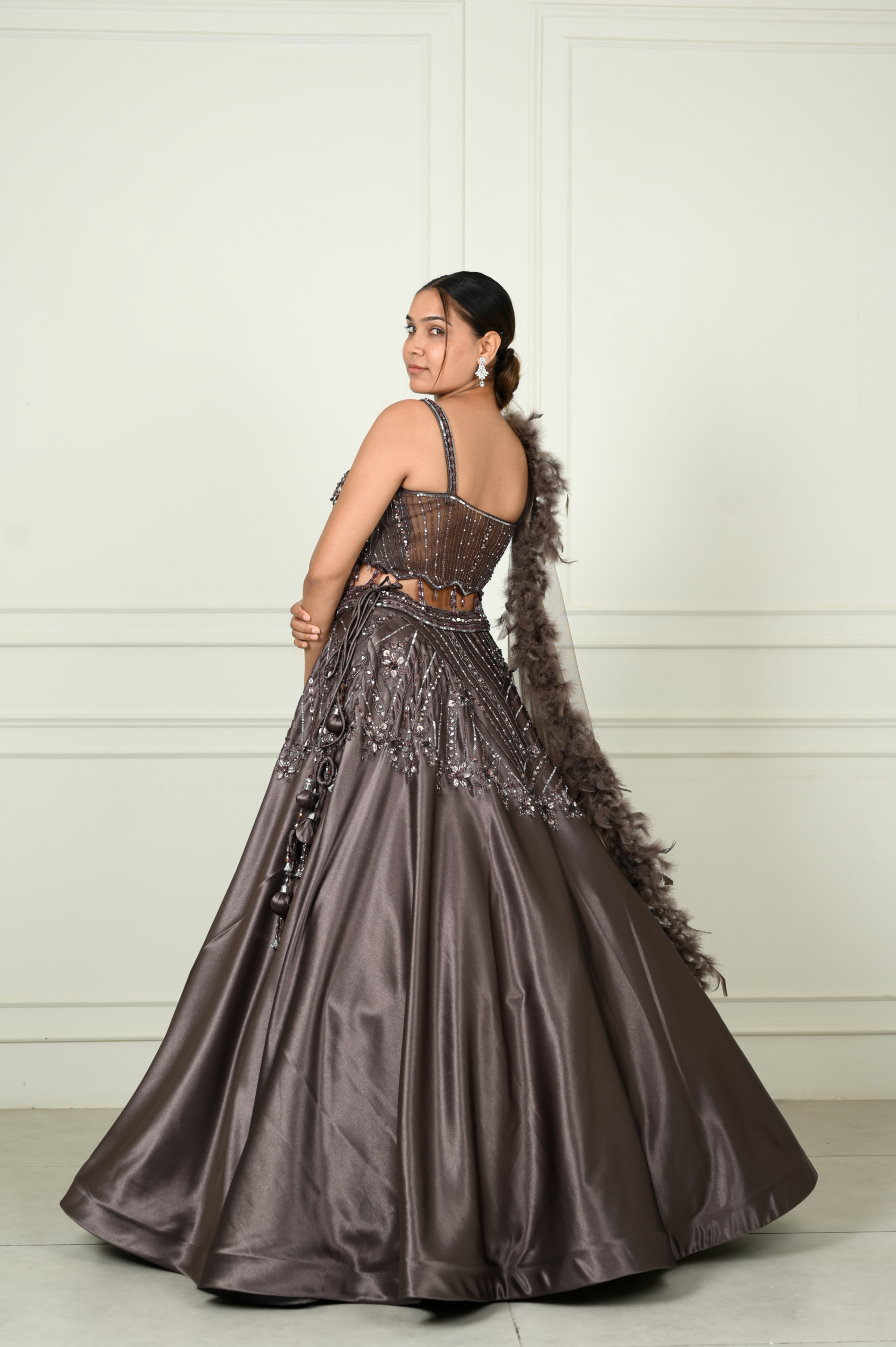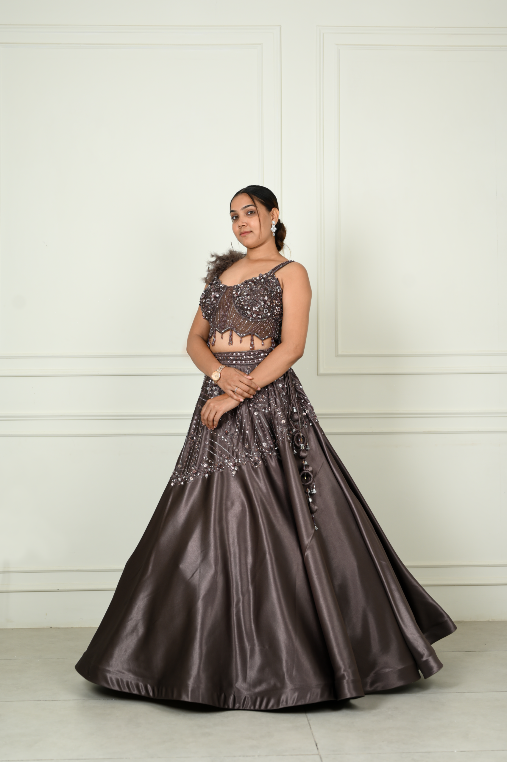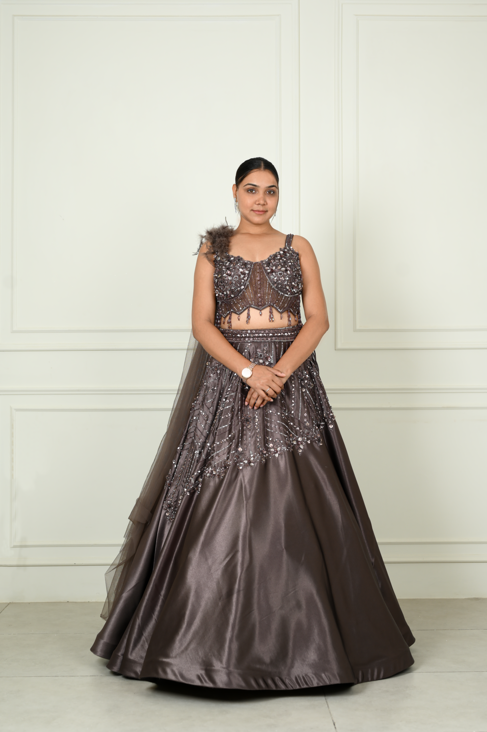 | Description | This elegant brown lehenga set showcases understated luxury with a modern edge. The embellished blouse features intricate sequin and 3D work embroidery with delicate fringe detailing, enhanced by a subtle feather accent for a statement finish. Paired with a rich, flowy skirt adorned with scattered embellishments and a soft Turkish sattin layer, the ensemble offers graceful movement and depth. Ideal for evening weddings, engagement,receptions, and festive gatherings, this lehenga blends refined craftsmanship, contemporary design, and timeless sophistication. |